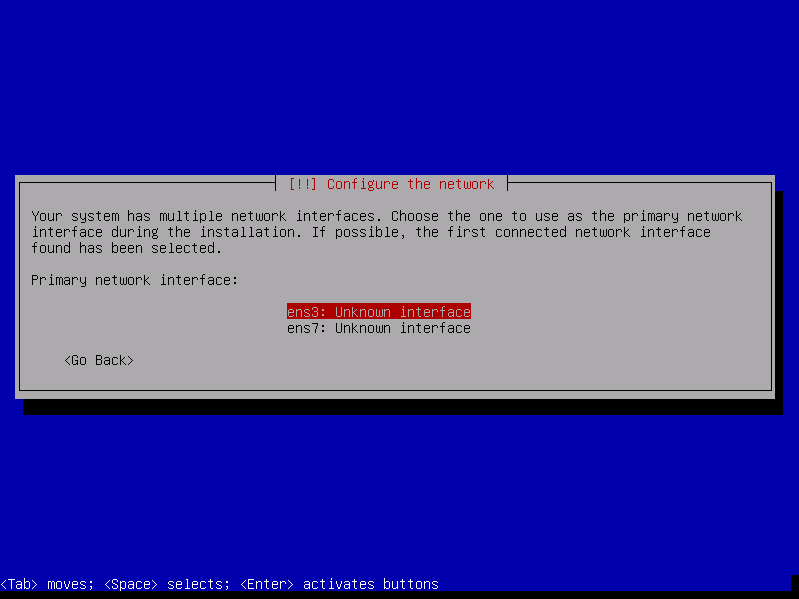 Proceed with the next steps based on your preference. During the installation, just choose leave most of the options at their default value. You will reach a section where it would ask you for the primary network interface. Choose “ens3”.