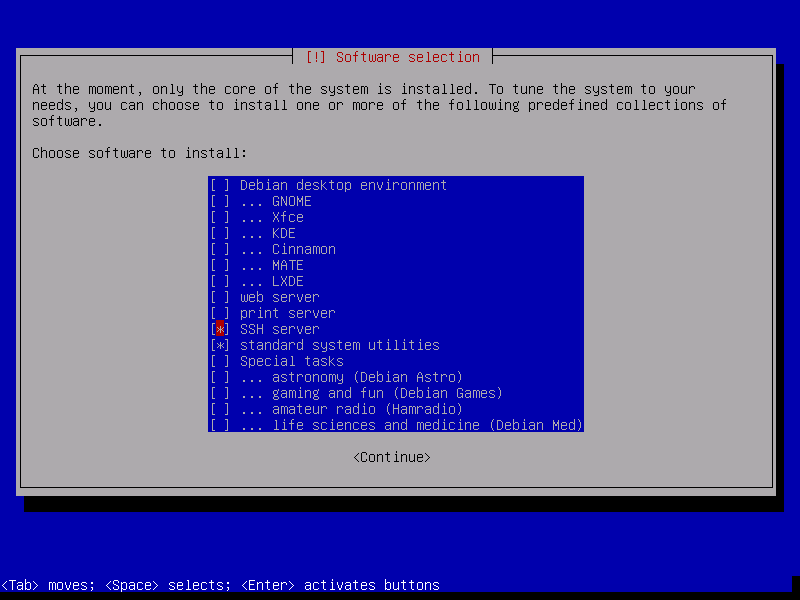 When you reach the “Software selection”, only select “SSH server” and “standard system utilities”.