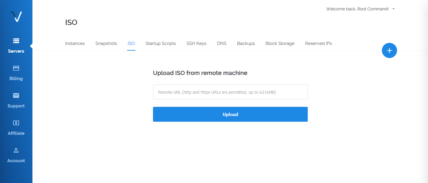 Once you have registered an account, login to the control panel and go to the Servers > ISO tab. From there you will have the option to upload a custom ISO by providing the direct download link of the image.