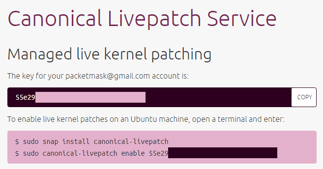 sudo snap install canonical-livepatch sudo canonical-livepatch enable <TOKEN> |